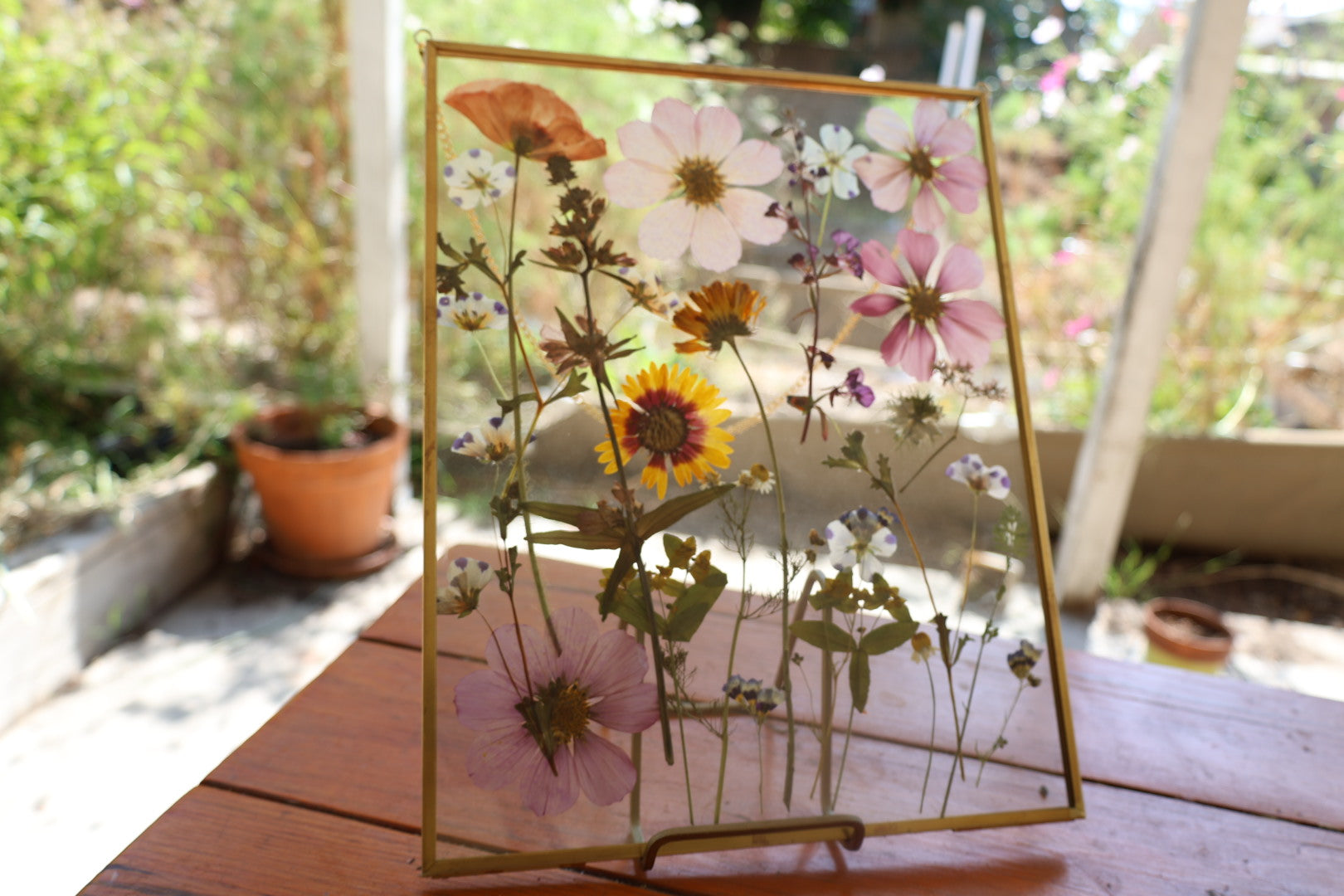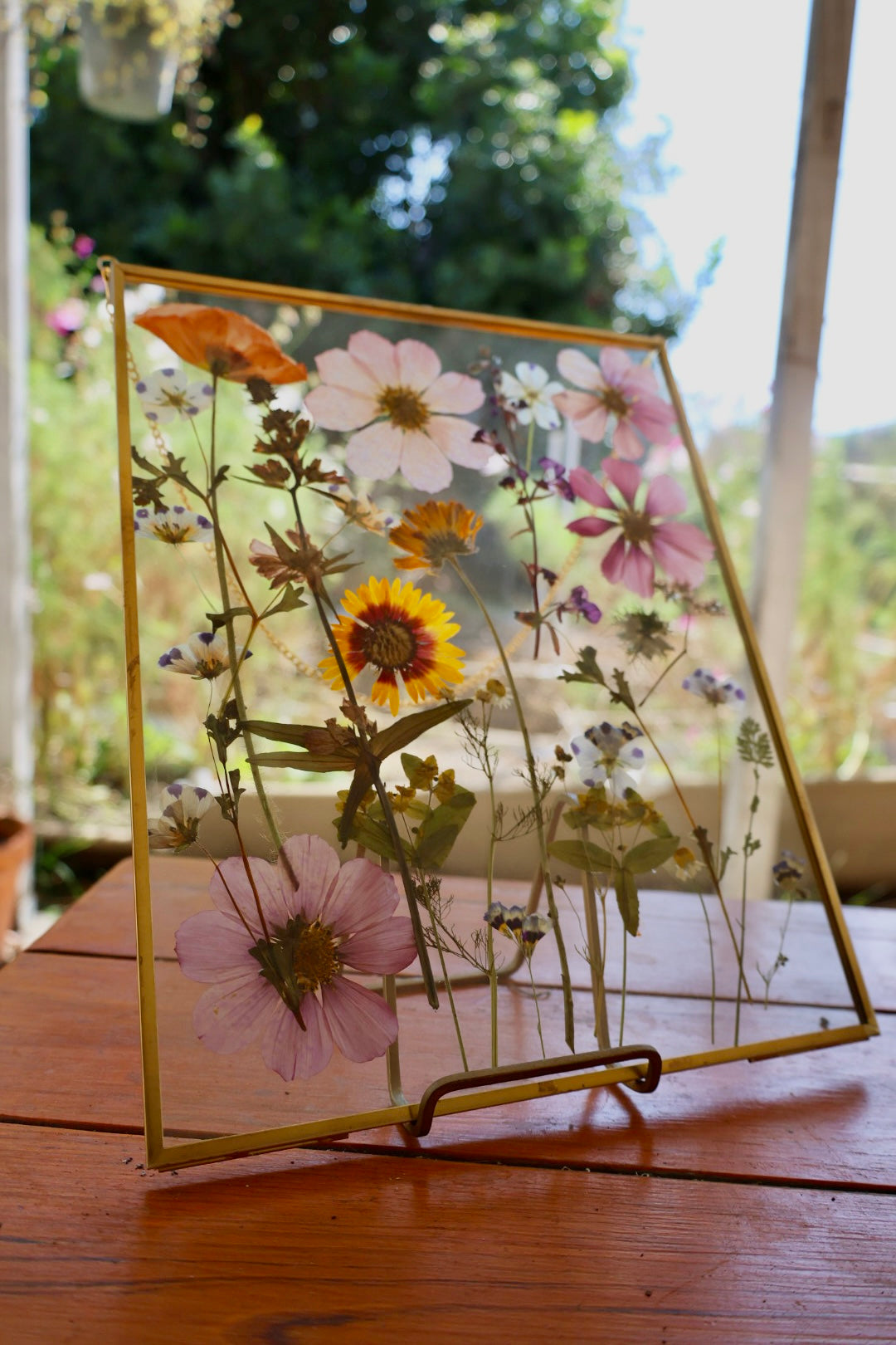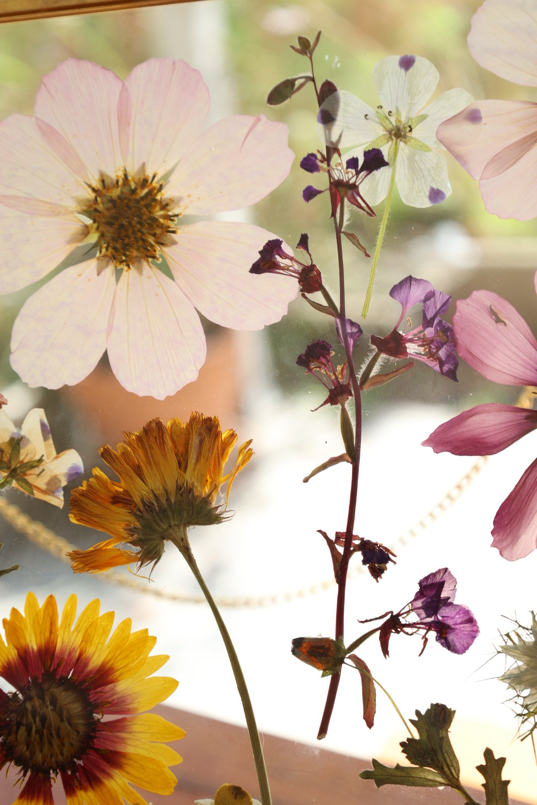 Pressed flower art in gold frame, 11 inches x 14 inches