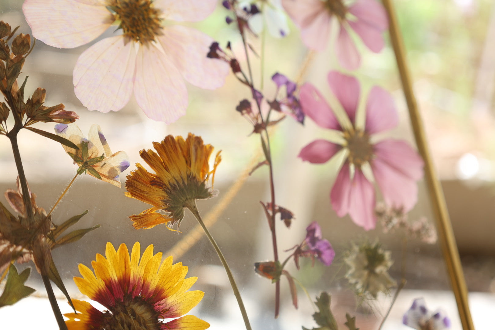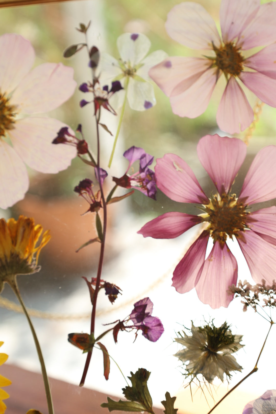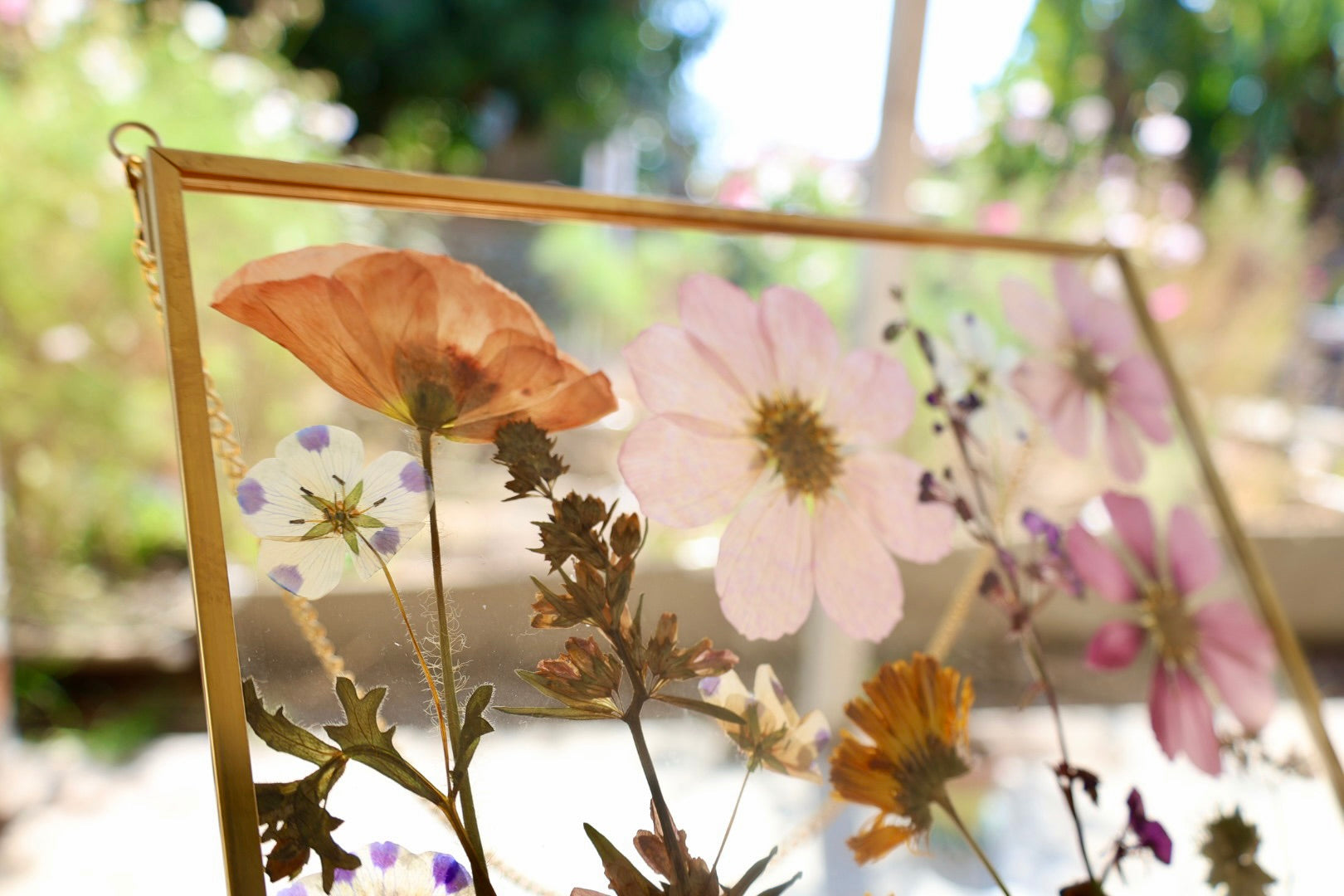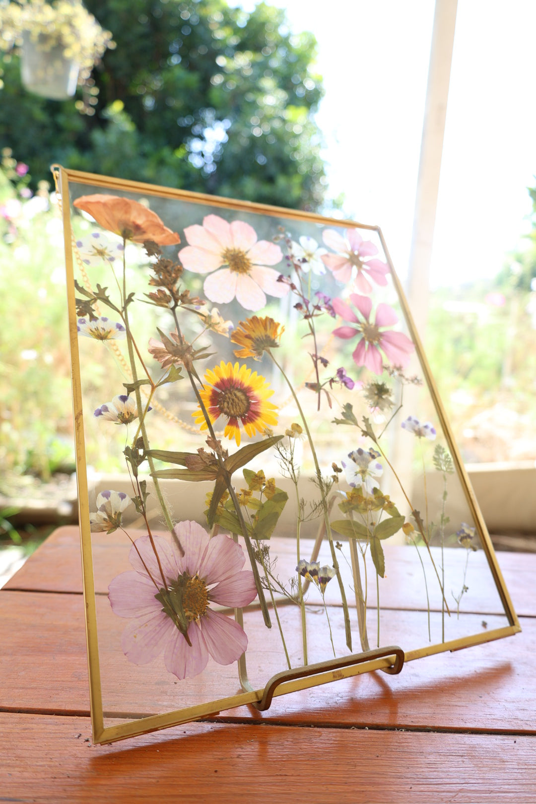 Pressed flower art in gold frame, 11 inches x 14 inches