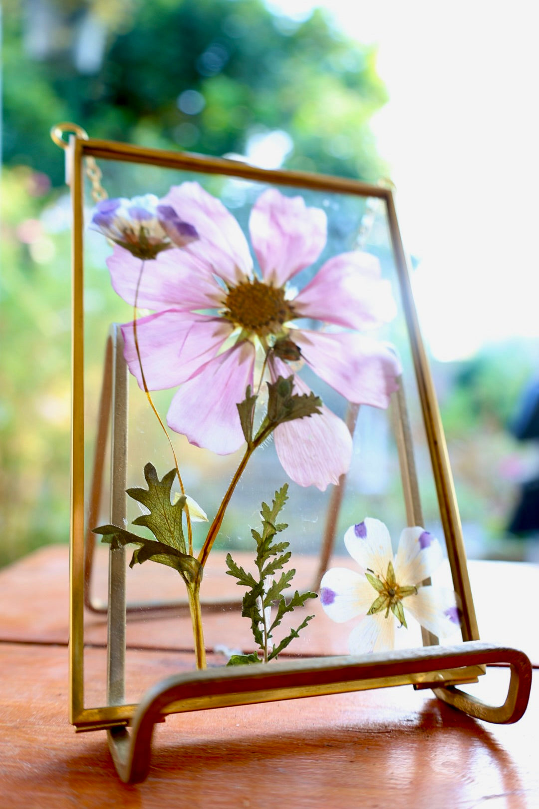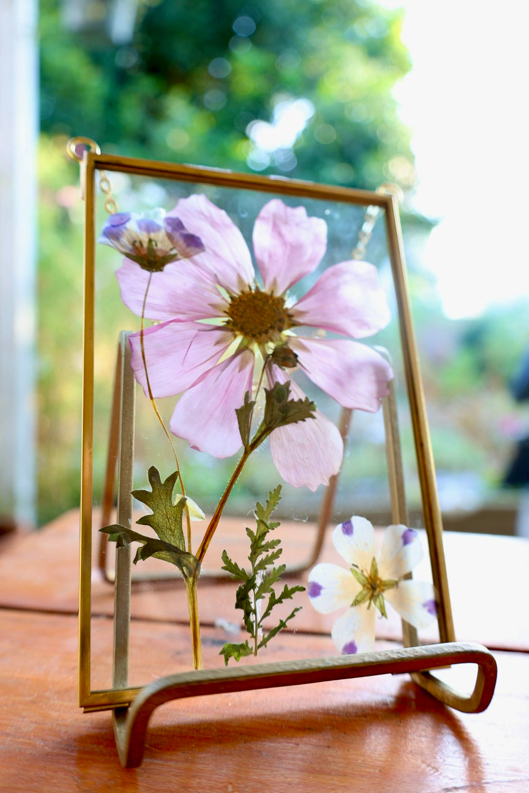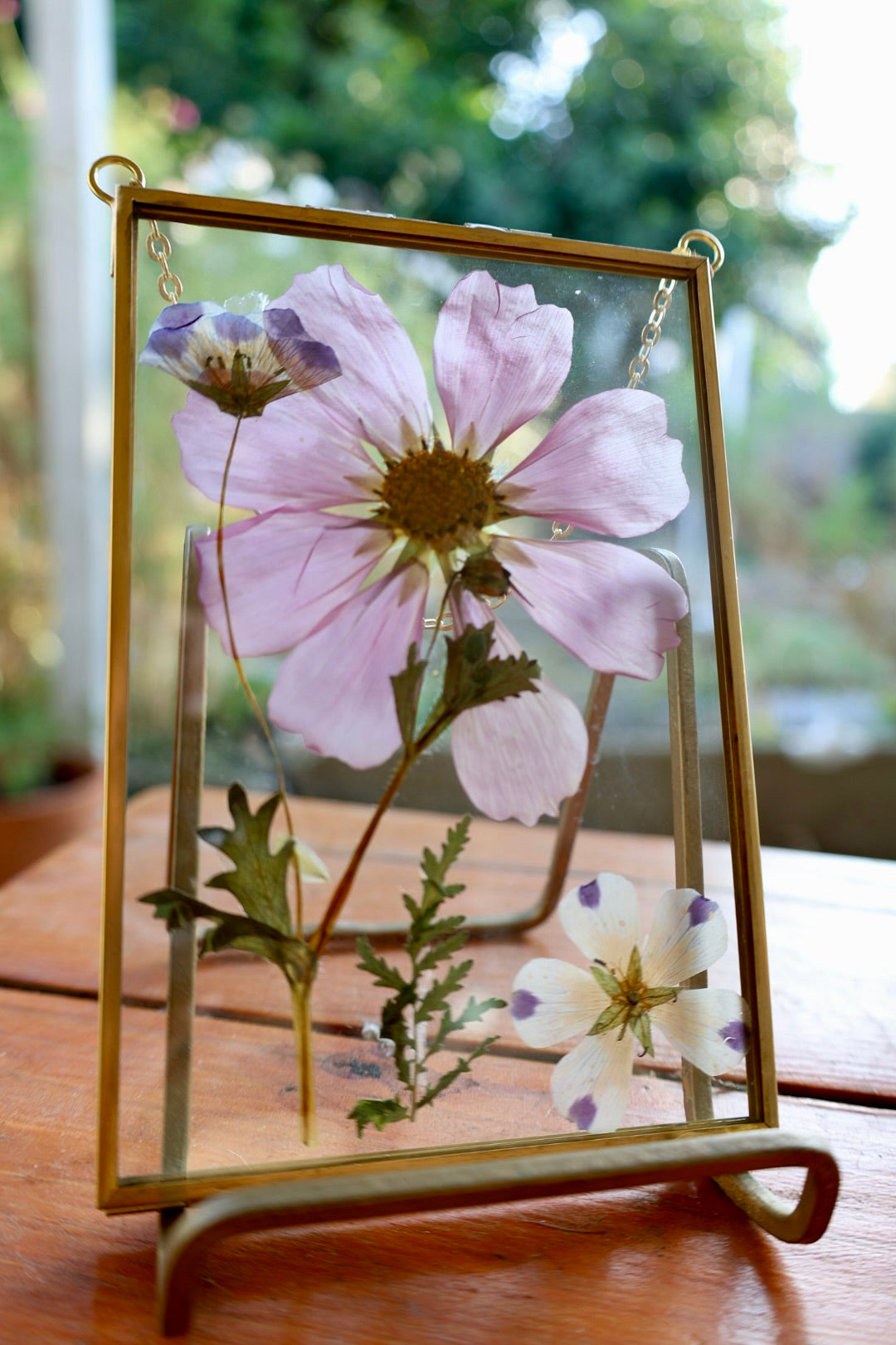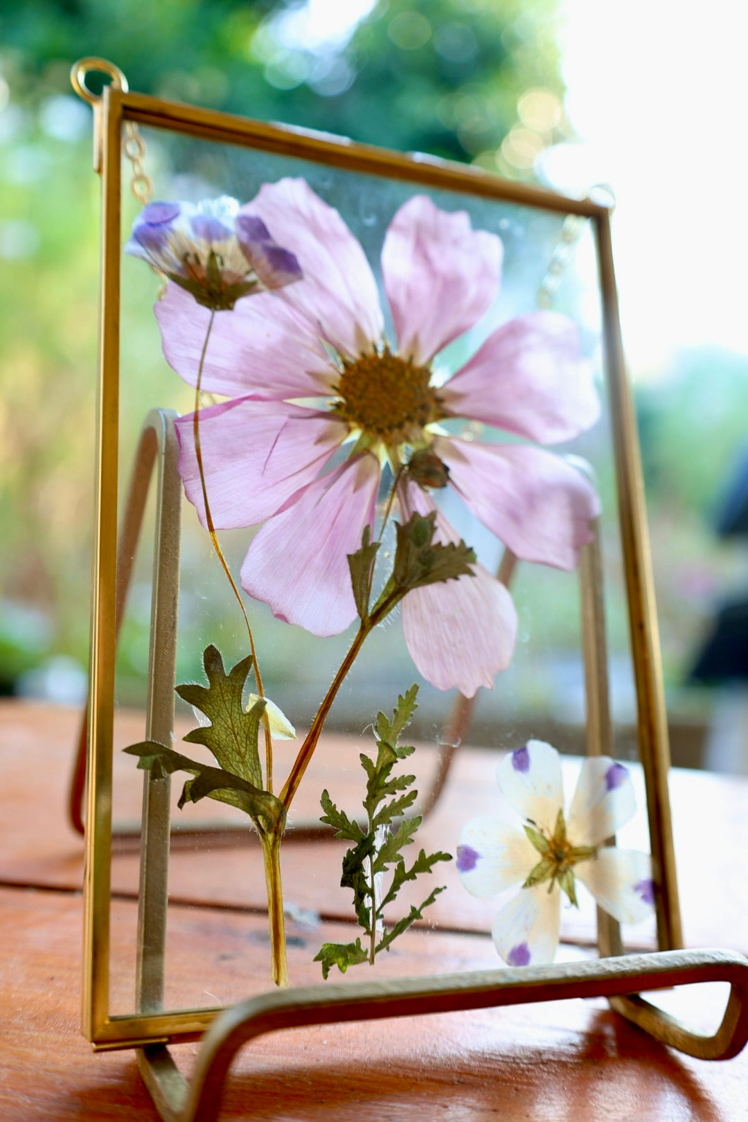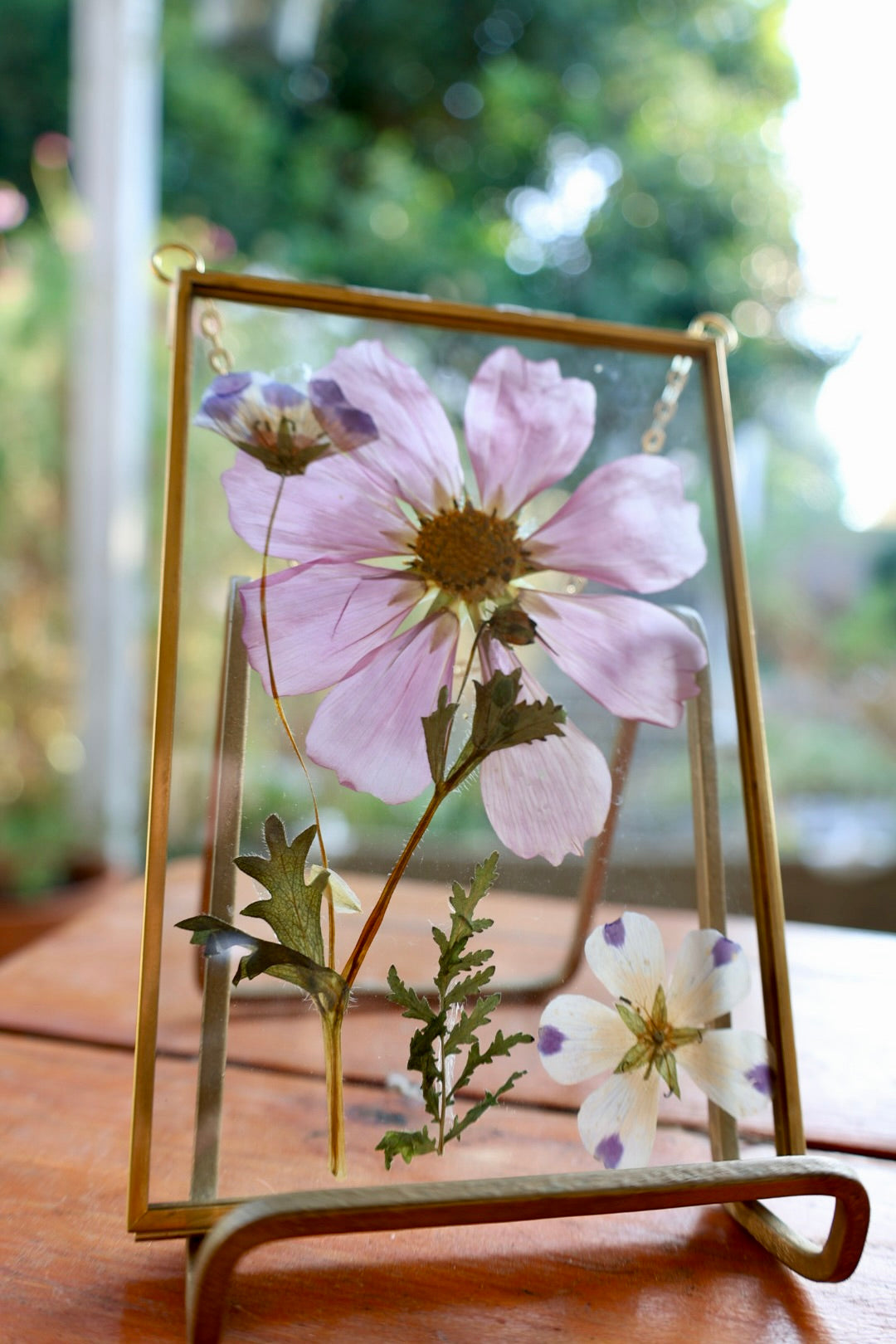 Pressed Flower Art in Gold Frame with Cosmos and California Native Flowers, 4"x6"