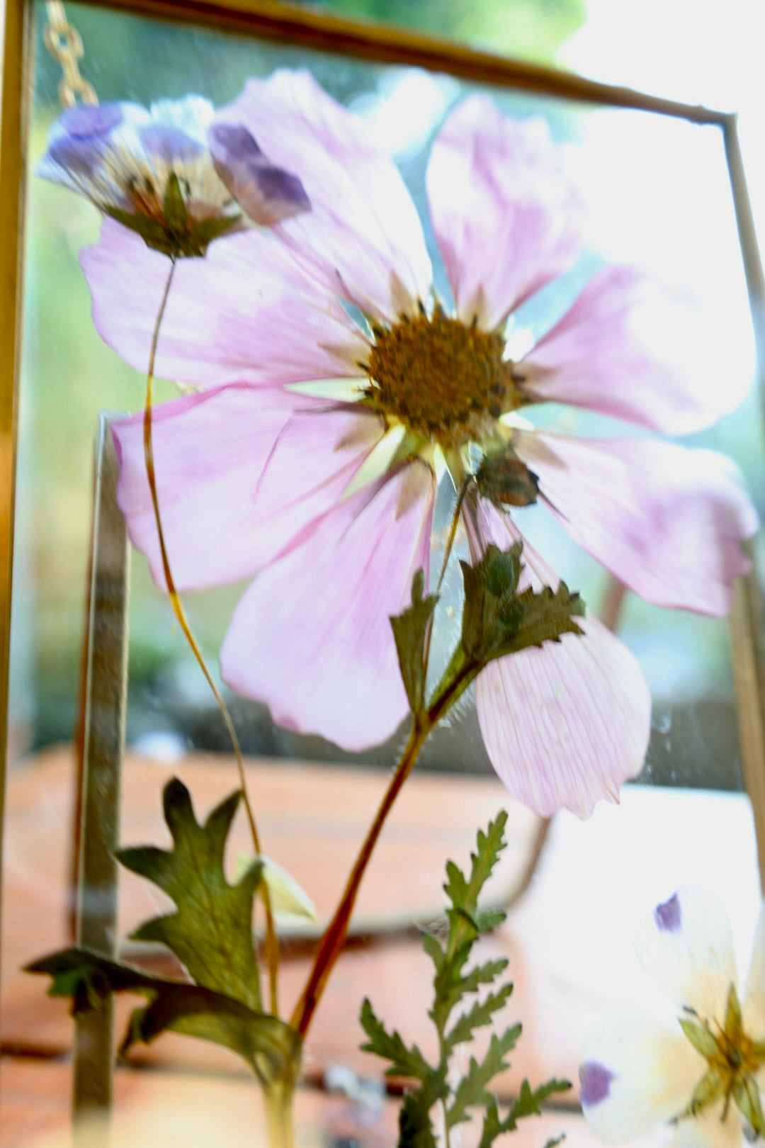 Pressed flower art made locally in Long Beach, California featuring cosmos and California native plant "five spot."
