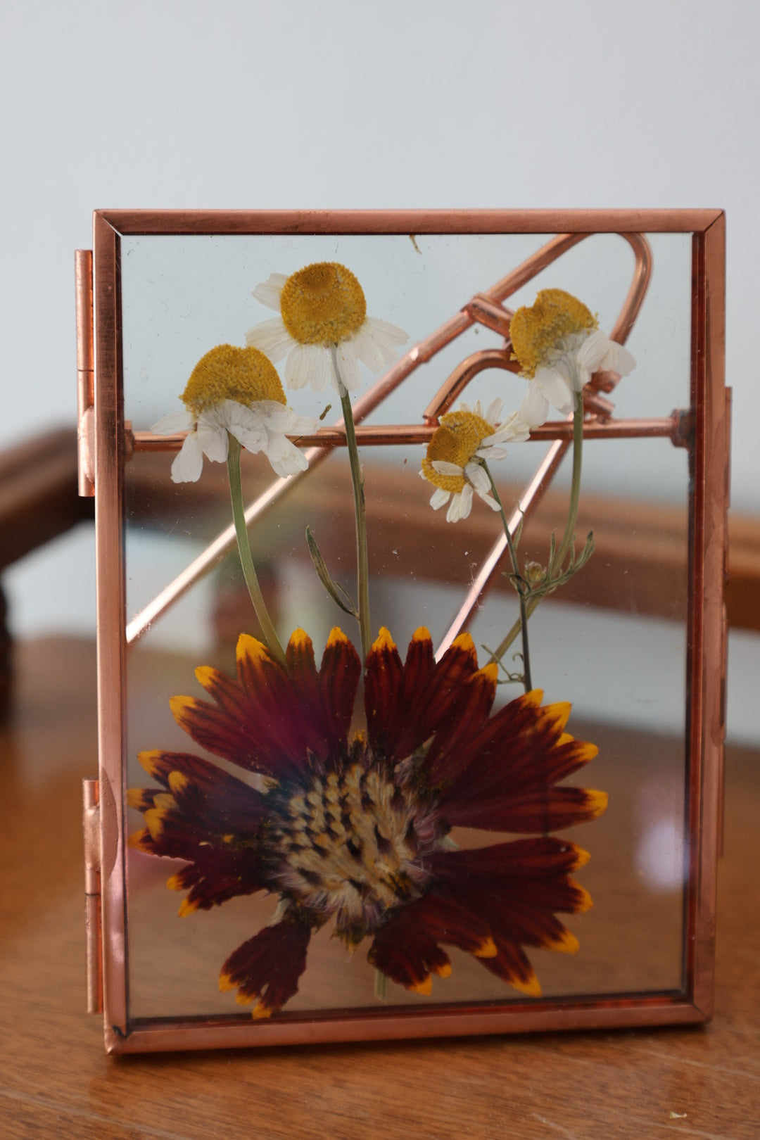 Pressed Flower Art in Small Frame with Chamomile and Coreopsis, in Rose Gold Frame, 3 inch x 4 inch
