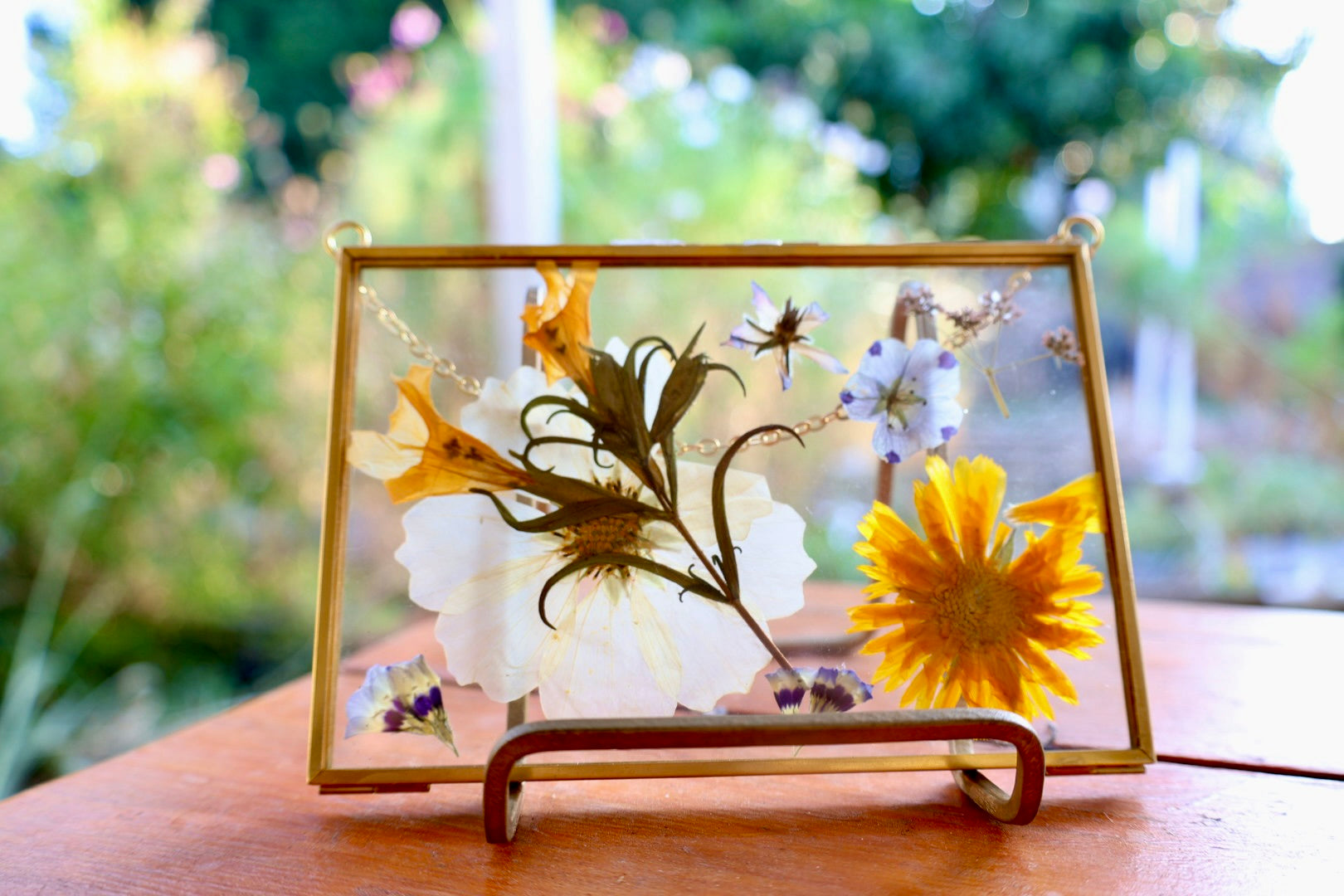 Pressed Flower Art with Real Flowers in Gold Frame with Chain, 4”x6”