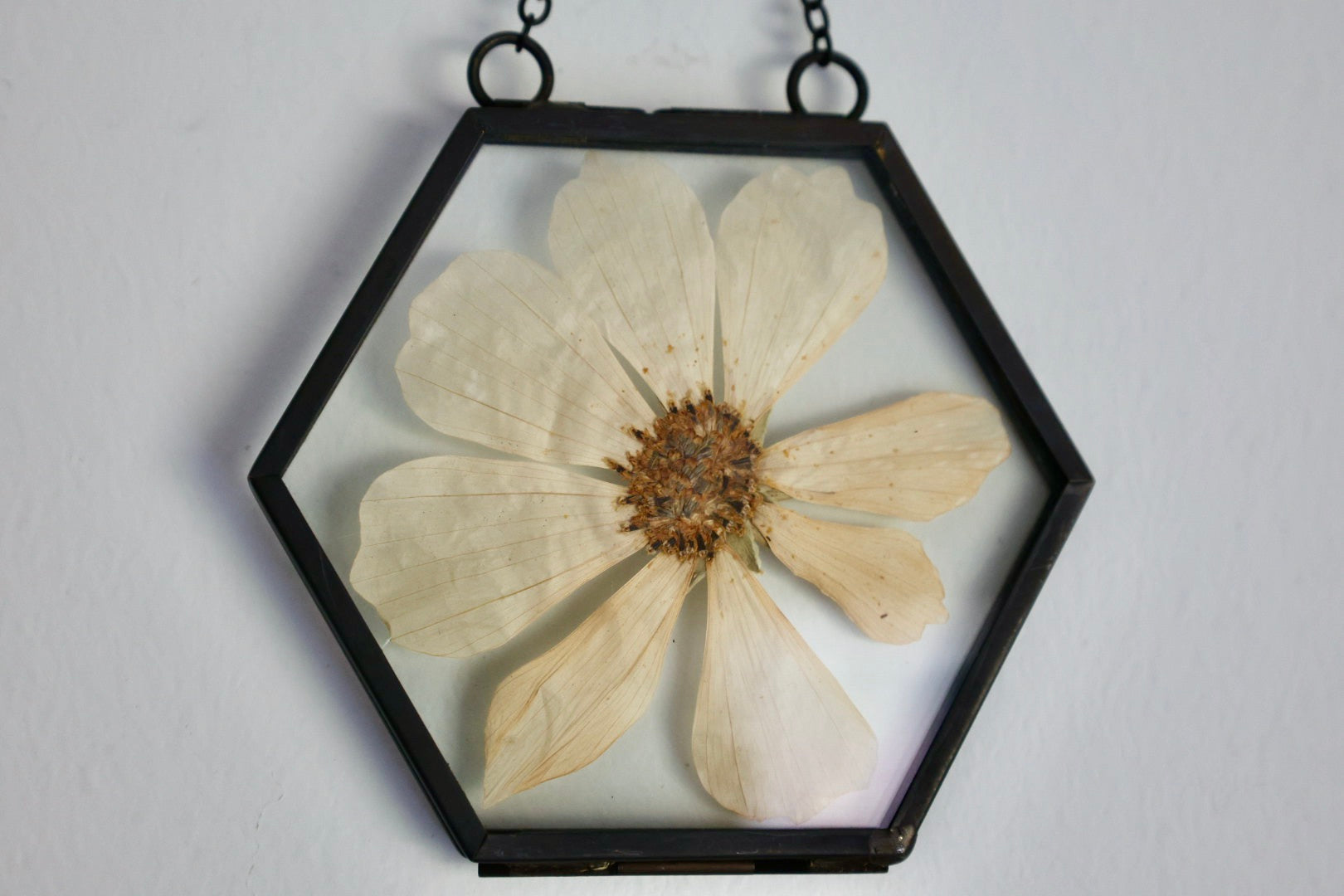 Pressed Flower Frame in Black Hexagon Frame with White Cosmo, 2"x3"