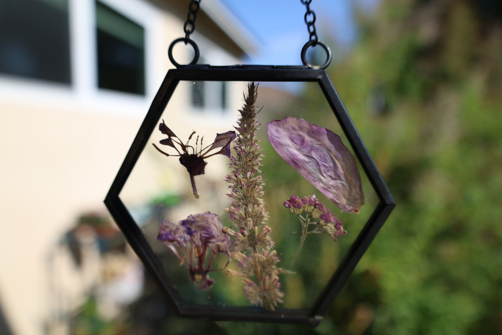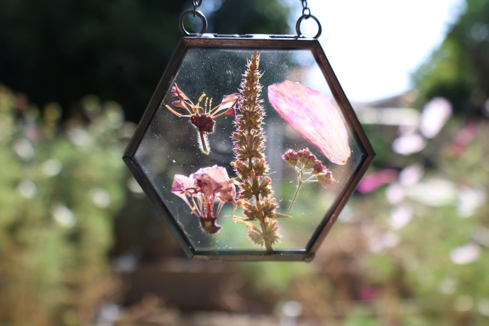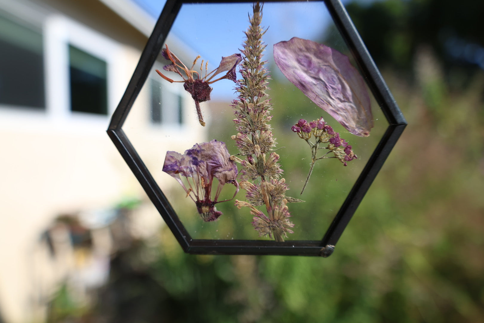 Real pressed flowers in black hexagon glass frame, 2”x2”