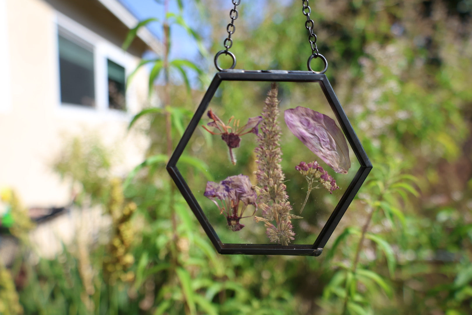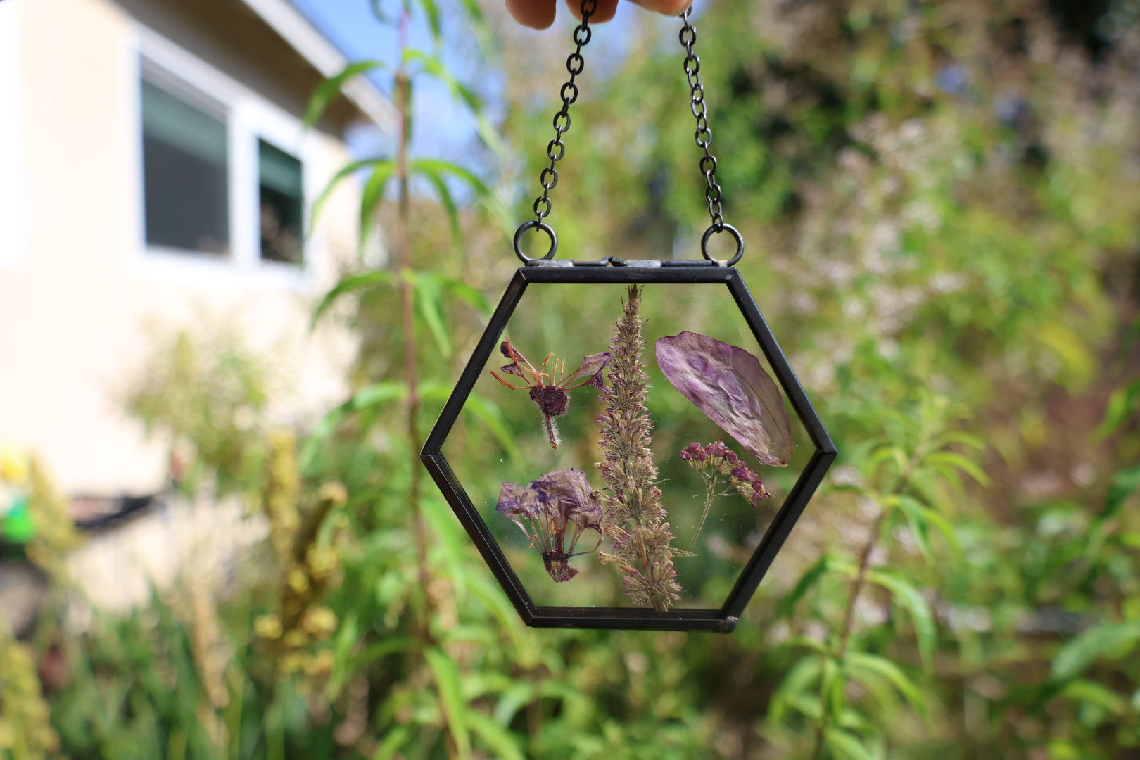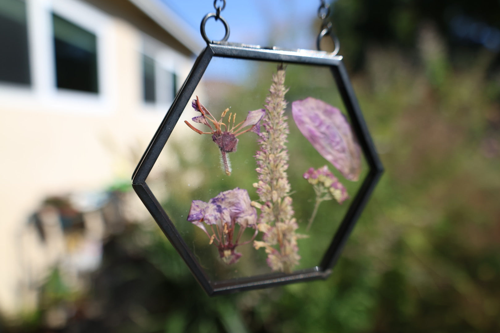 Real pressed flowers in black hexagon glass frame, 2”x2”