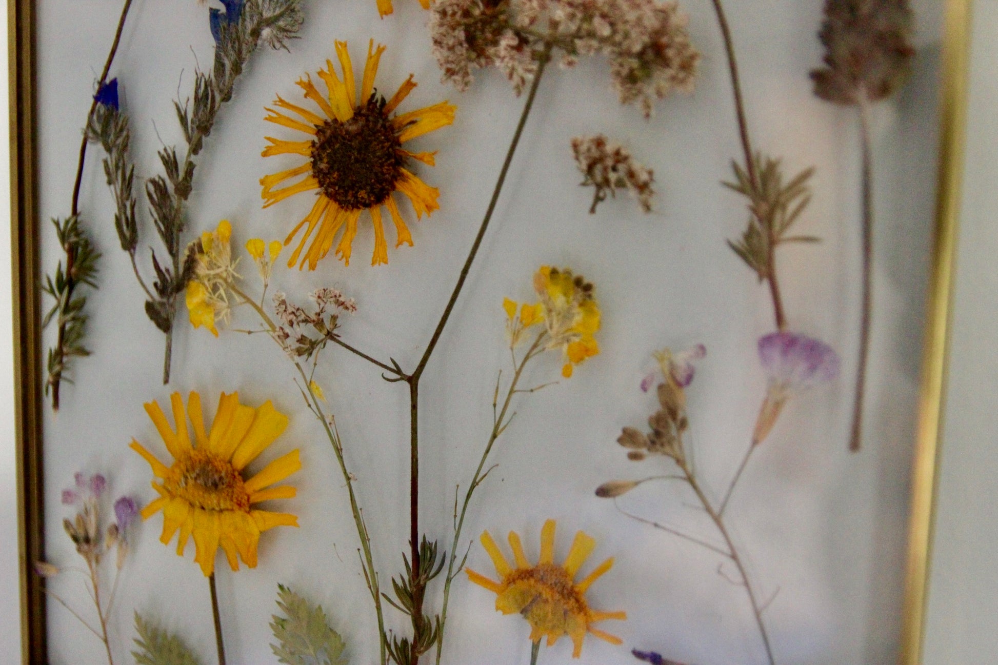 Pressed flowers include California bush sunflowers, buckwheat, and calendula.
