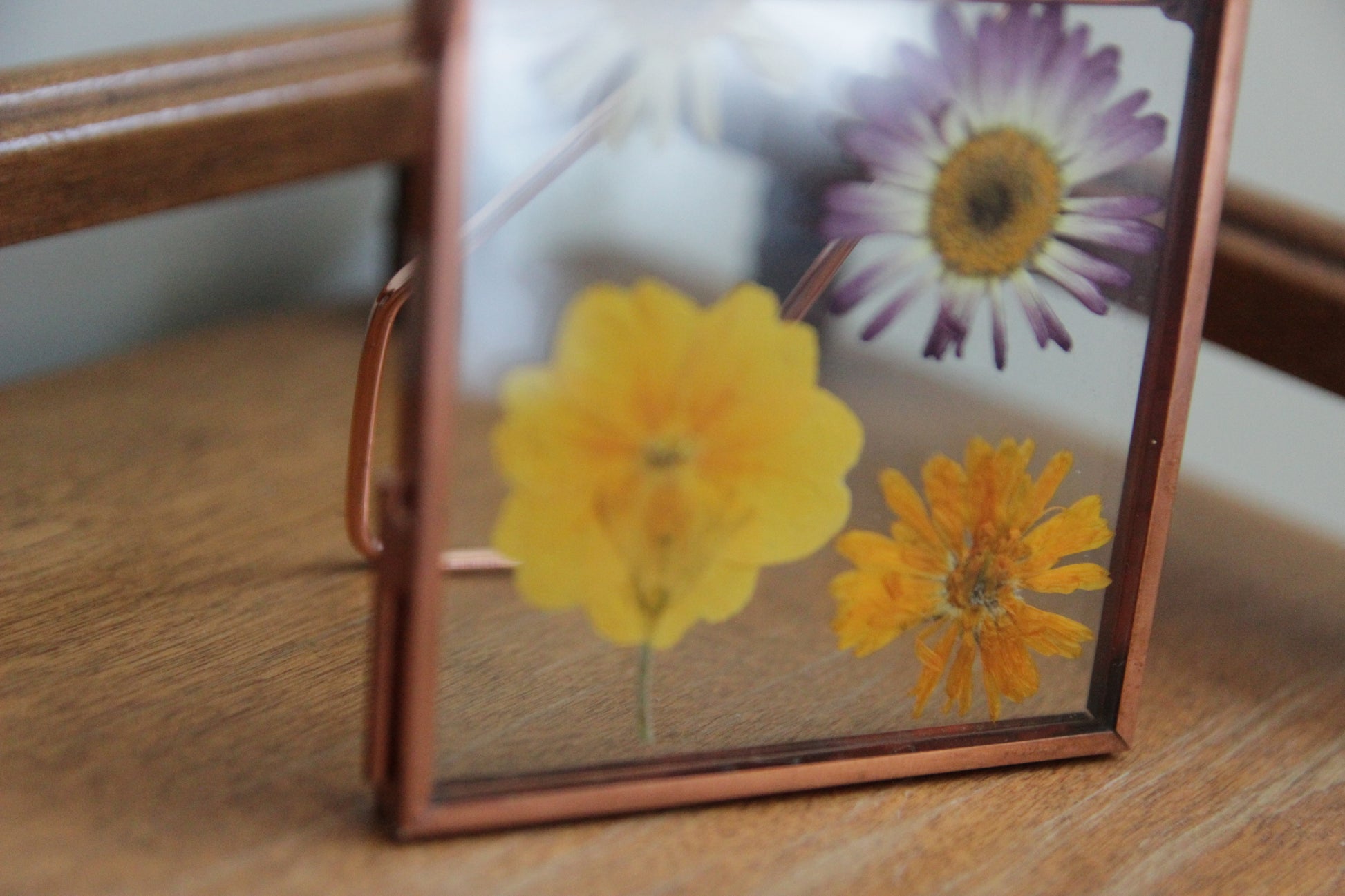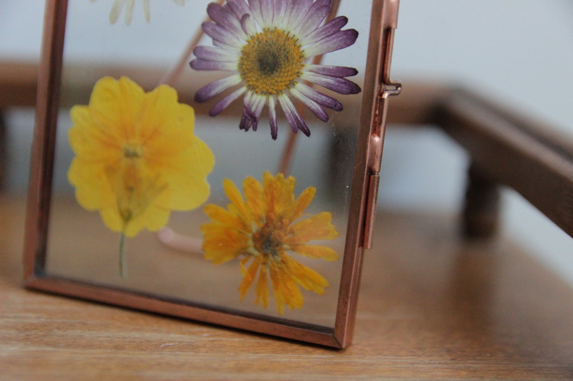 Small 3"x4" glass frame in rose gold with real pressed flowers. All flowers were grown organically at the Cal Natural Gardens home garden in Long Beach, California.